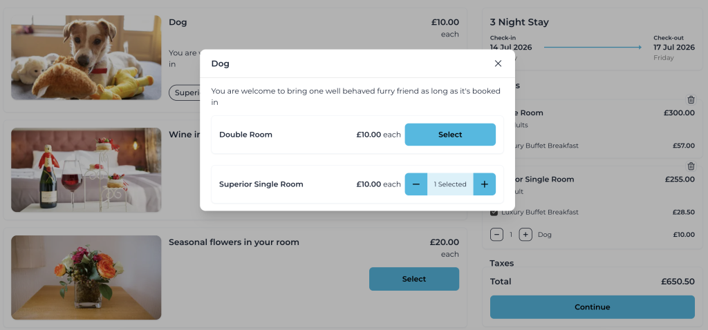 Allowing you or the guest to match units with extras means that you’ll always know which units need which extras – you’ll be adding the bottle of wine or the bunch of flowers to the right unit first time! The tooltip hover-over in the diary will show you the correct extras for that portion of the booking. This makes a booking with more than one unit booked much easier to manage.